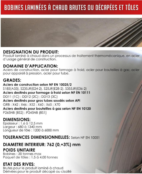 Produit laminé à chaud dans un processus de traitement thermomécanique, en acier d'usage général de construction. Domaine d'application : Aciers de construction, acier pour formage à froid, acier pour bouteilles à gaz, acier pour appareil à pression, acier pour tube. Dimensions: Epaisseur: 1.6 à 12.5 mm Largeur: 650 à 1340 mm Longueur de tôle: 1200 à 6000 mm