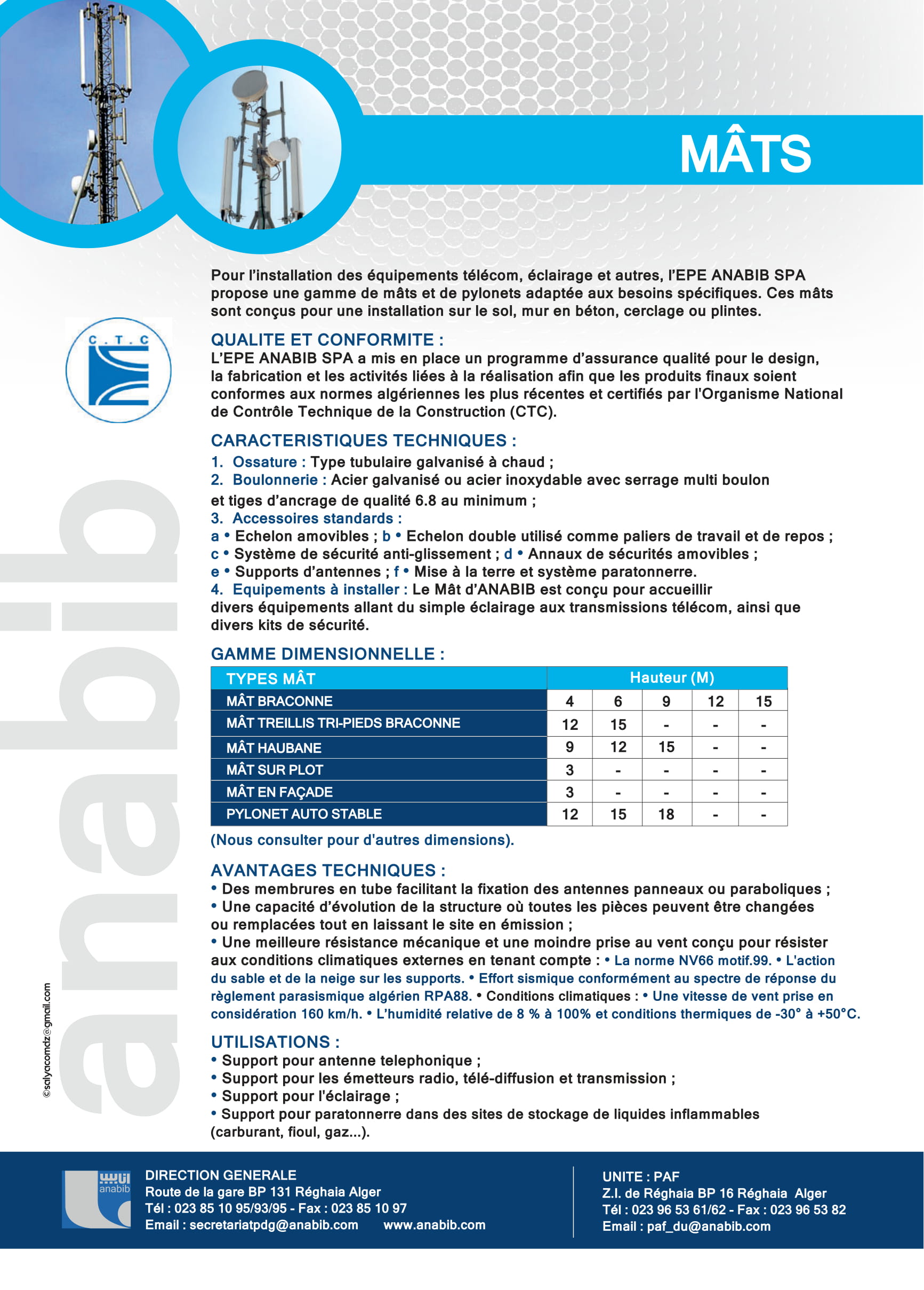 Pour l’installation des équipements télécom, éclairage et autres, l’EPE ANABIB SPA propose une gamme de mâts et de pylônes adaptée aux besoins spécifiques. Ces mâts sont conçus pour une installation sur le sol, mur en béton, cerclage ou plintes. QUALITE ET CONFORMITE : L’EPE ANABIB SPA a mis en place un programme d’assurance qualité pour le design, la fabrication et les activités liées à la réalisation afin que les produits finaux soient conformes aux normes algériennes les plus récentes et certifiés par l'Organisme National de Contrôle Technique de la Construction (CTC). CARACTERISTIQUES TECHNIQUES : 1. Ossature : Type tubulaire galvanisé à chaud ; 2. Boulonnerie : Acier galvanisé ou acier inoxydable avec serrage multi boulon et tiges d'ancrage de qualité 6.8 au minimum ; GAMME DIMENSIONNELLE : TYPES Mats Hauteur (M) MÂT BRACONN 4 6 9 12 15 MÂT TREILLIS TRI-PIEDS BRACONNE 12 15 - - - MÂT HAUBANE 9 12 15 - - MÂT SUR PLOT 3 - - - - MÂT EN FAÇADE 3 - - - - PYLONET AUTO STABLE 12 15 18 - - UTILISATIONS : •Support pour antenne téléphonique ; •Support pour les émetteurs radio, télé-diffusion et transmission ; •Support pour l'éclairage ; •Support pour paratonnerre dans des sites de stockage de liquides inflammables (carburant, fioul, gaz...).