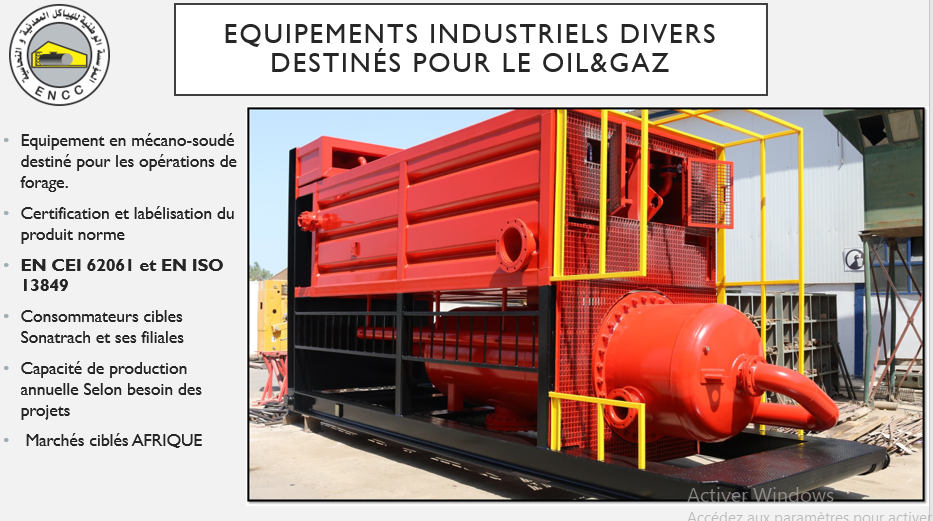 - Equipement en mécano-soudé destiné pour les opérations de forage. - Certification et labellisation du produit norme : EN CEI 62061 et EN ISO 13849 - Consommateurs cibles: Sonatrach et ses filiales - Capacité de production annuelle: Selon besoin des projets. Marchés ciblés: Afrique
