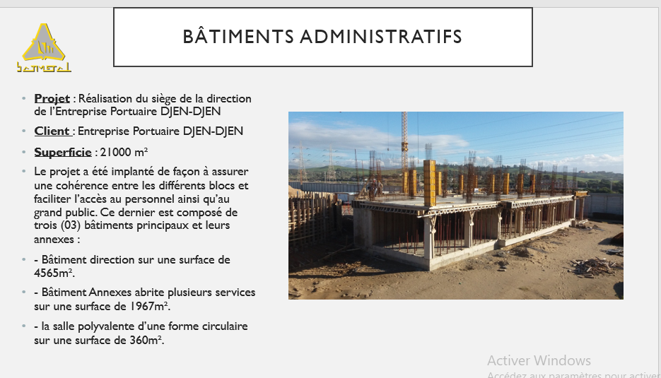 Projet : Réalisation du siège de la direction de l’Entreprise Portuaire DJEN-DJEN Client : Entreprise Portuaire DJEN-DJEN Superficie : 21000 m² Le projet a été implanté de façon à assurer une cohérence entre les différents blocs et faciliter l’accès au personnel ainsi qu’au grand public. Ce dernier est composé de trois (03) bâtiments principaux et leurs annexes : - Bâtiment direction sur une surface de 4565m². - Bâtiment Annexes abrite plusieurs services sur une surface de 1967m². - la salle polyvalente d’une forme circulaire sur une surface de 360m².