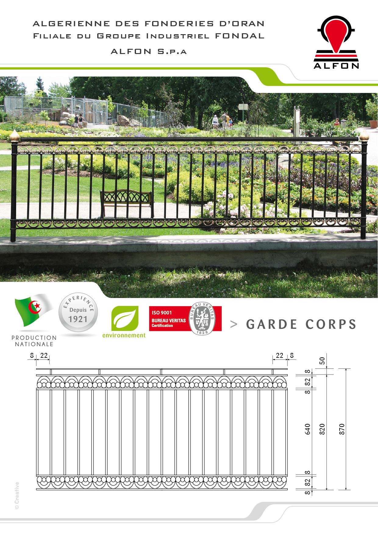 - Poids moyen au mètre carré : 27 Kg - Matières acier au carbone A56 /Motif en acier le reste en produits. - Hauteur préconisée de l'élément: 870mm - Longueur des motifs: 220mm - Hauteur des motifs: 820mm